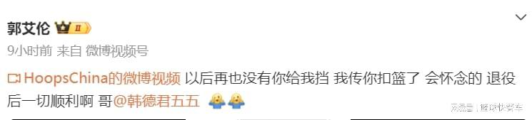 “以后再也没有你给我挡,我传你扣篮了,会怀念的,退役后一切顺利,哥。”得知韩德君官宣退役后,郭艾伦在社媒上如此写道。很显然,作为郭艾伦曾经的老搭档,也是他最敬重的老大哥,郭艾伦与韩德君的关系非常不错。当时,郭艾伦与韩德君的挡拆,也是CBA联赛一道亮丽风景线。只可惜,随着郭艾伦被交易送走,韩德君退役,CBA再也没有郭韩连线了。